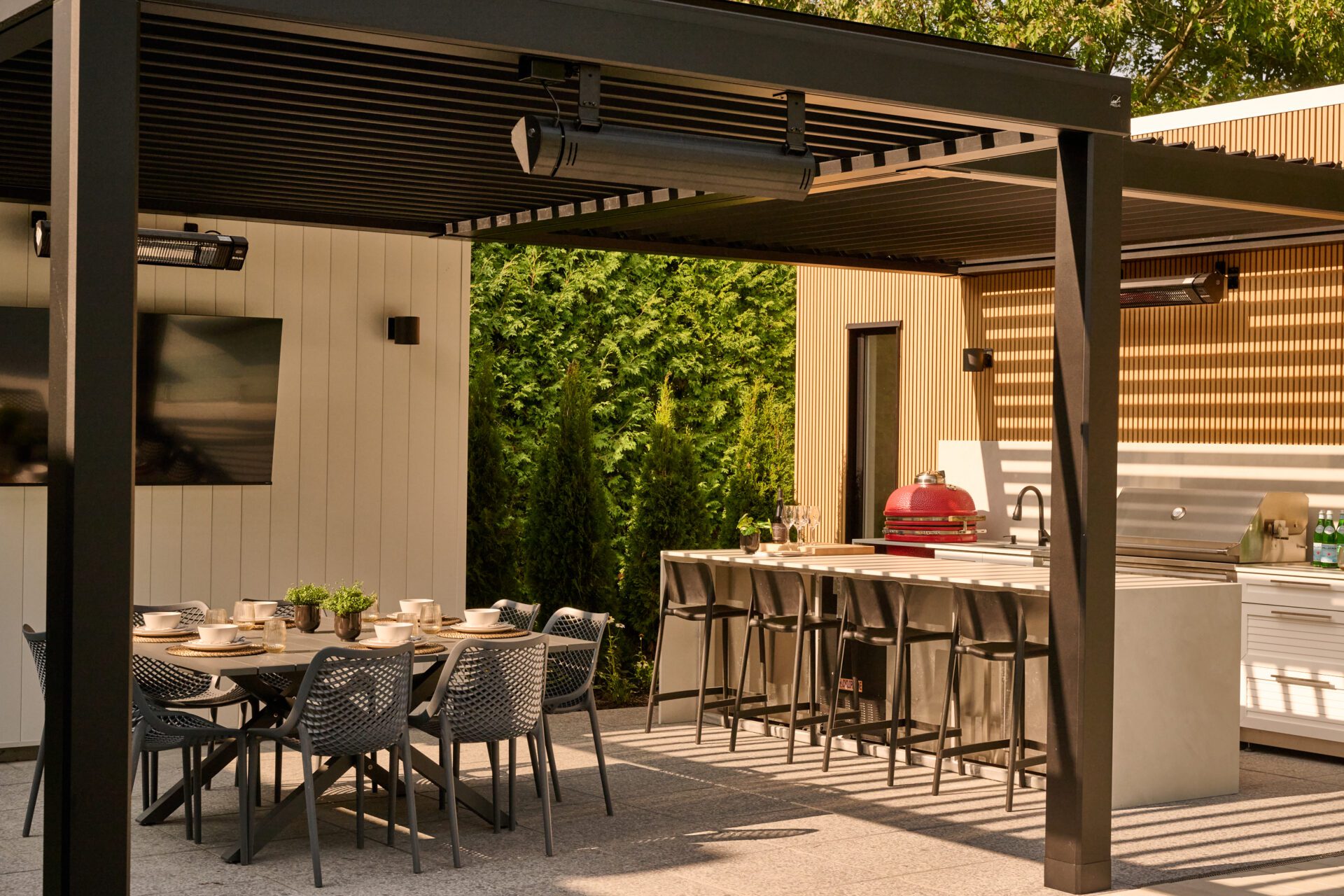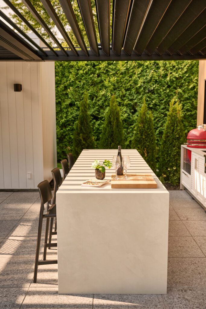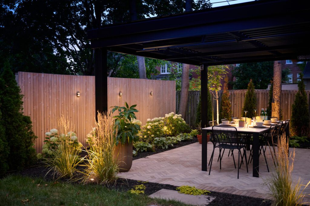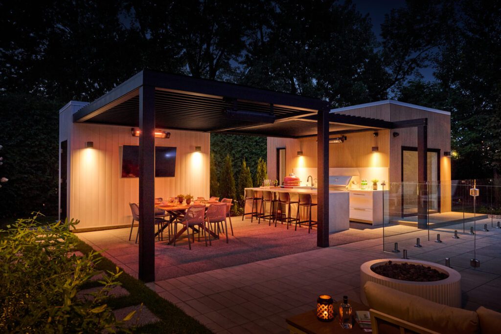 Au coucher du soleil, l’aménagement prend une nouvelle dimension. Les lames rétractables de la pergola Sol Pergola dessinent au sol et sur les surfaces un jeu d’ombres et de lumière en parfaite continuité avec le thème du projet : des lignes qui se répondent et structurent l’espace jusque dans ses moindres détails.