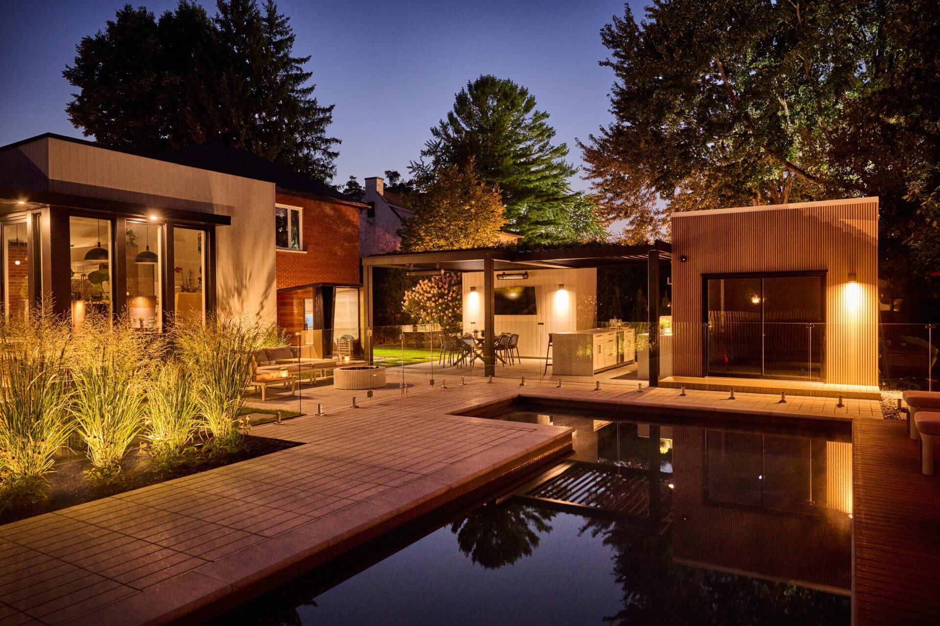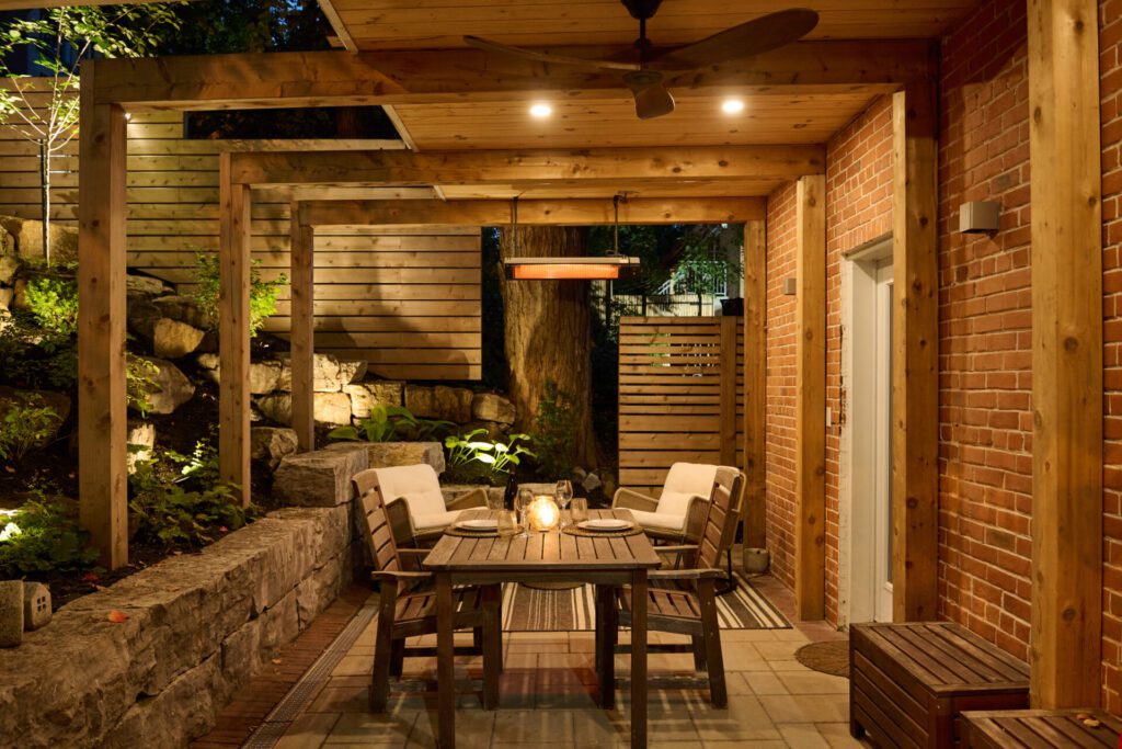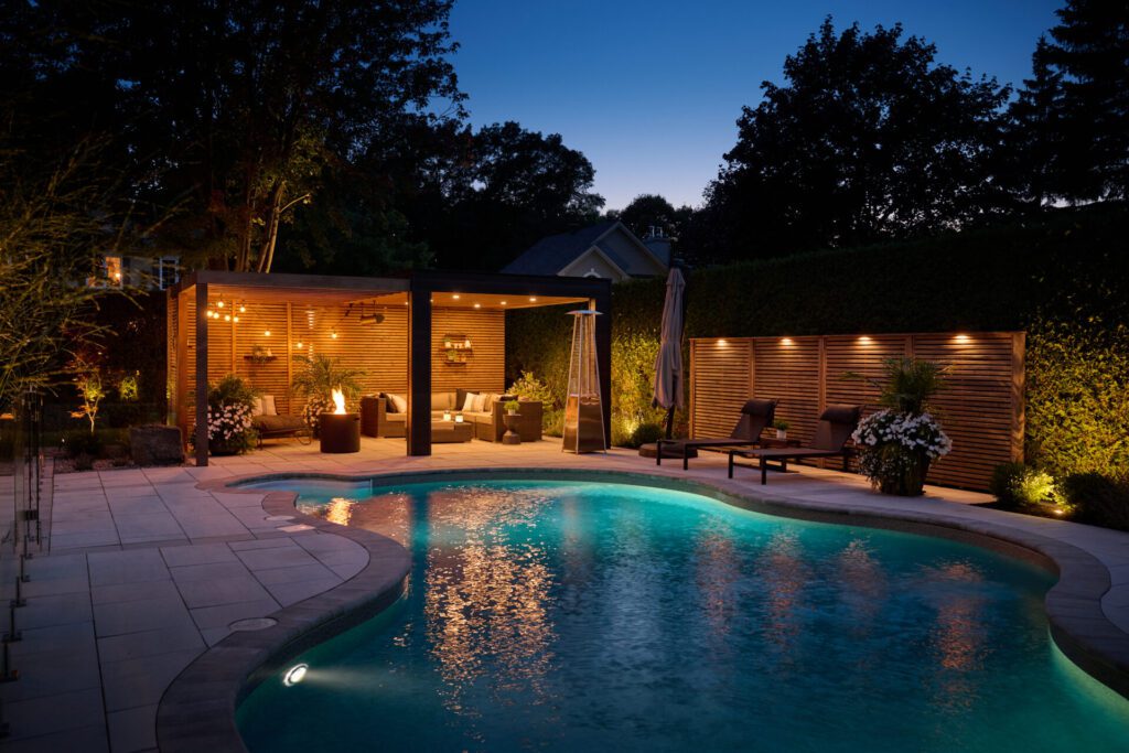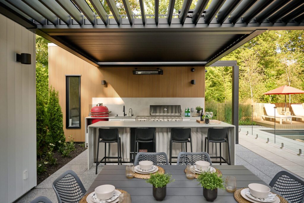 Au coucher du soleil, l’aménagement prend une nouvelle dimension. Les lames rétractables de la pergola Sol Pergola dessinent au sol et sur les surfaces un jeu d’ombres et de lumière en parfaite continuité avec le thème du projet : des lignes qui se répondent et structurent l’espace jusque dans ses moindres détails.
