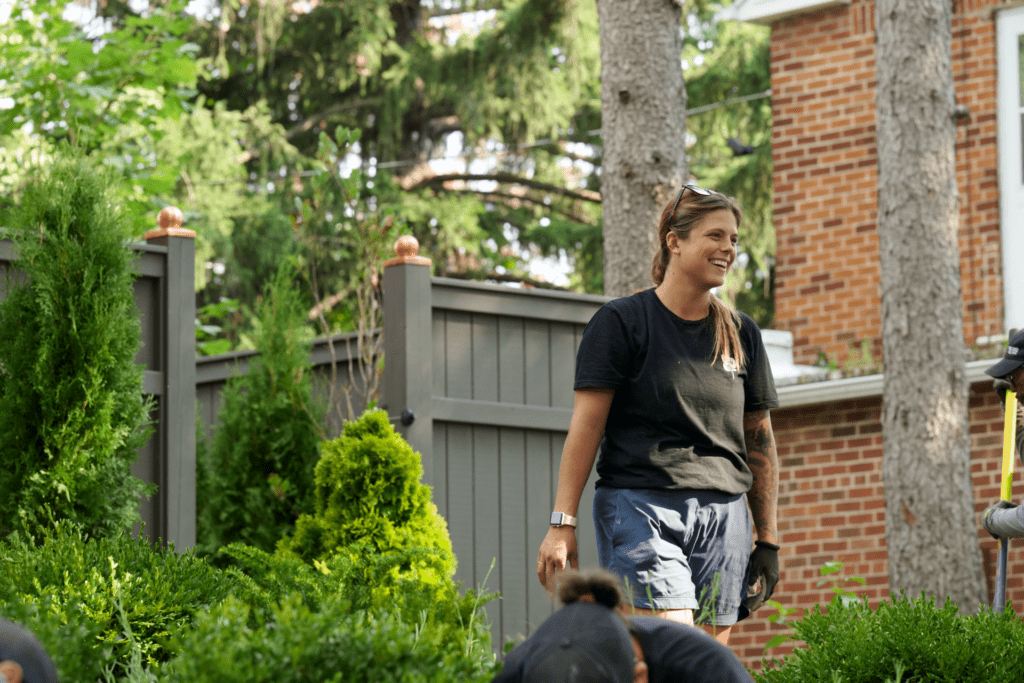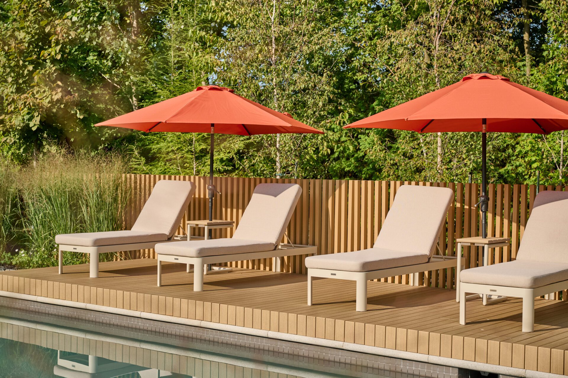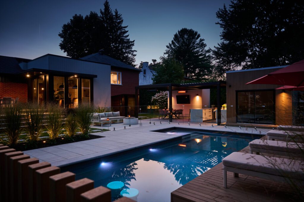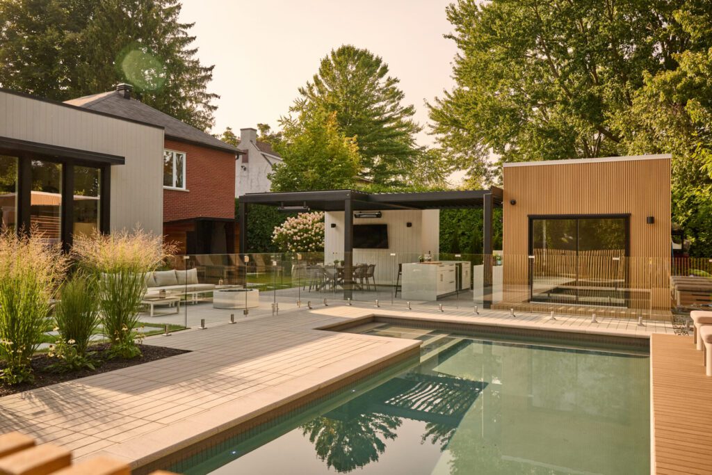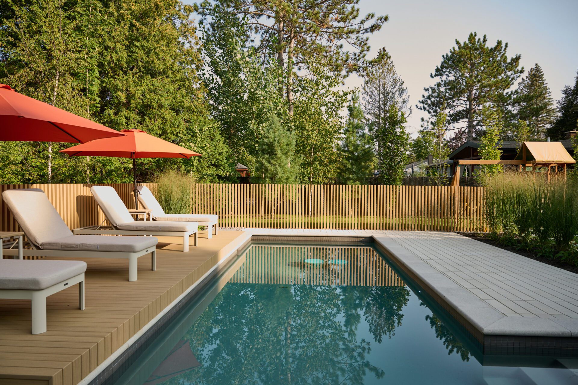 La clôture en composite NewTech Wood qui encadre la piscine renforce cet effet linéaire. Chaque poteau en 2×4 a été coulé individuellement dans une base de béton pour obtenir un rendu net, solide et épuré — une approche technique exigeante, mais essentielle pour atteindre la finition recherchée.