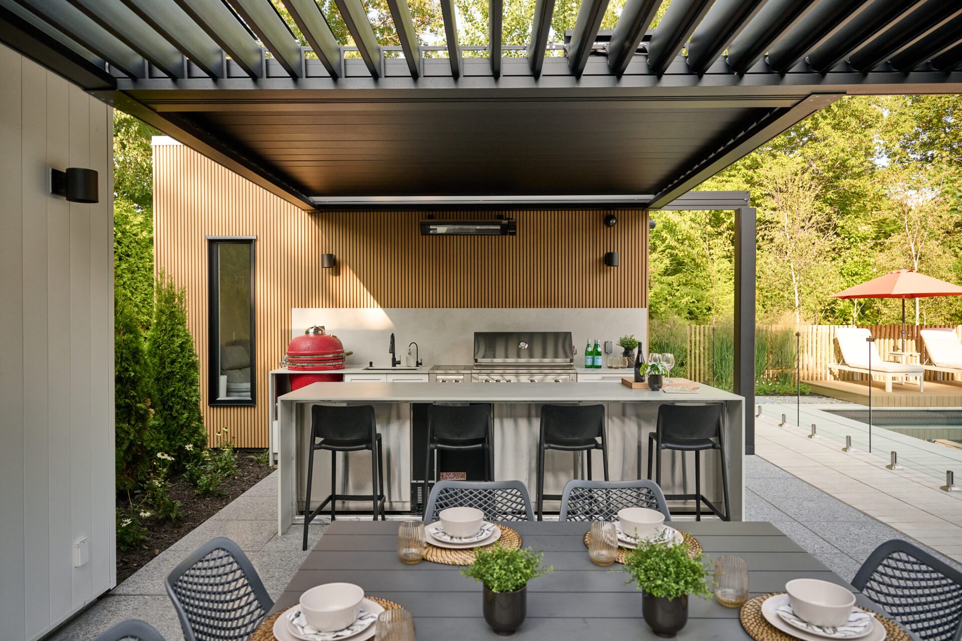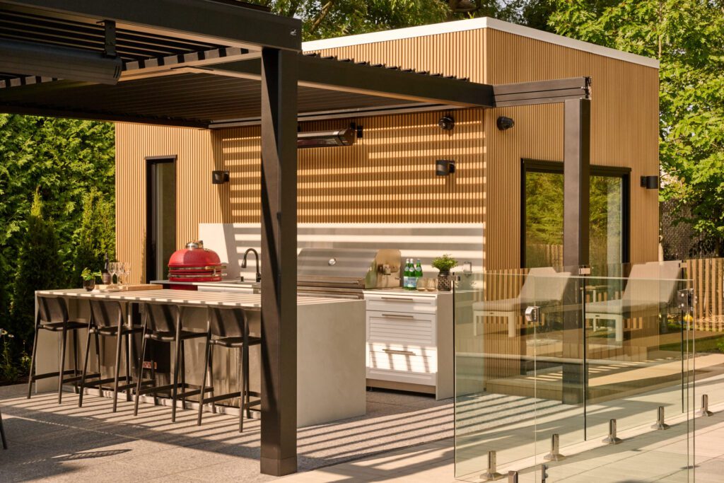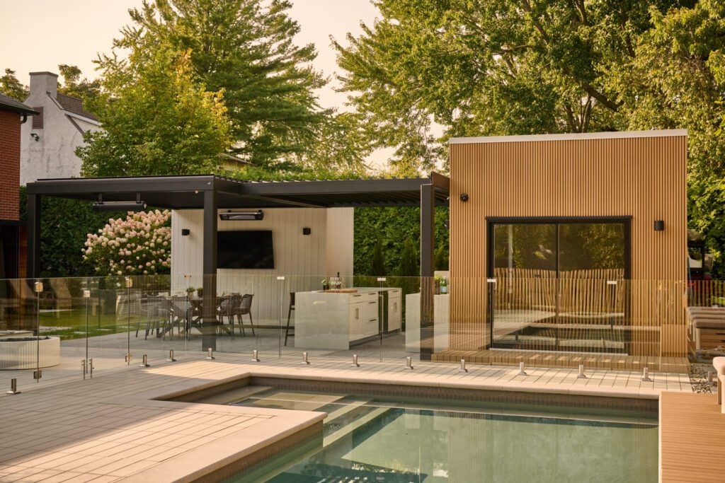 Le pool house, revêtu du même composite que la clôture, complète harmonieusement l’ensemble. Son volume rectiligne s’inscrit dans la continuité du design architectural principal, offrant un espace fonctionnel qui demeure discret et cohérent.