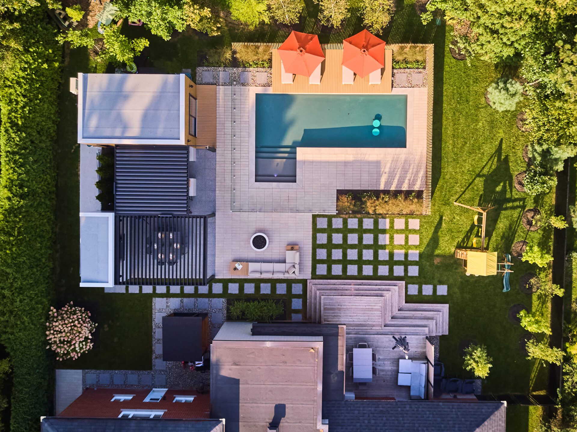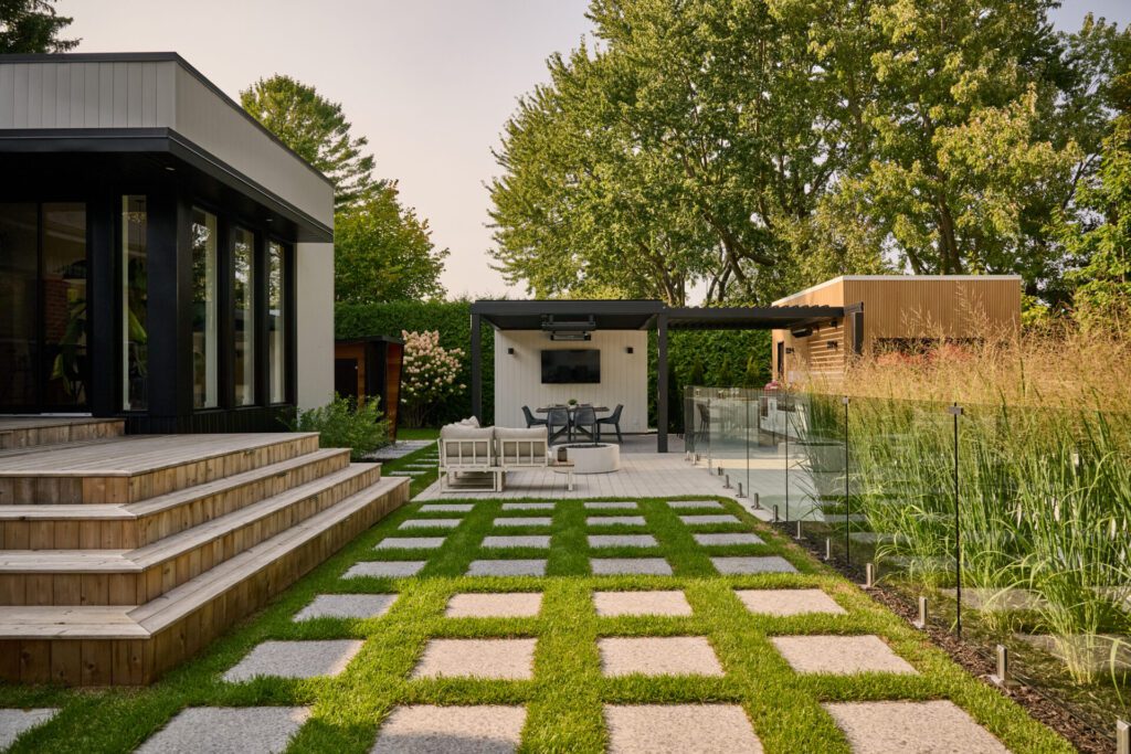 Les zones de vie – salle à manger, cuisine extérieure et espaces de détente – sont définies par un contraste subtil entre les matériaux. La dalle Terrazzo noir Météore de Techo‑Bloc, intégrée en damier dans la pelouse, crée un rythme visuel dynamique tout en guidant les déplacements entre les différentes sections du jardin. Ce motif géométrique se retrouve dans plusieurs perspectives aériennes du projet et contribue à son caractère graphique.