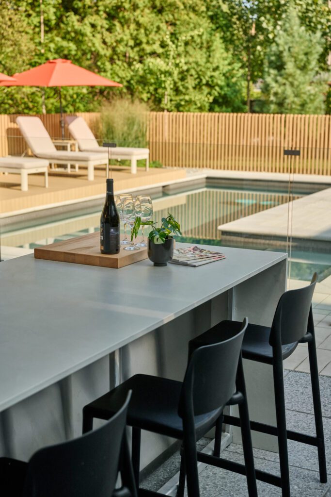 La piscine creusée existante a été entièrement démantelée puis reconstruite en béton projeté, selon de nouvelles dimensions adaptées au terrain et au concept général. Autour du bassin, l’espace a été maximisé grâce à une plateforme en composite accueillant les chaises longues, ce qui crée une zone de détente élégante et parfaitement intégrée. Le choix des dalles Industria posées avec joints alignés souligne le parti pris du projet : des lignes droites assumées.