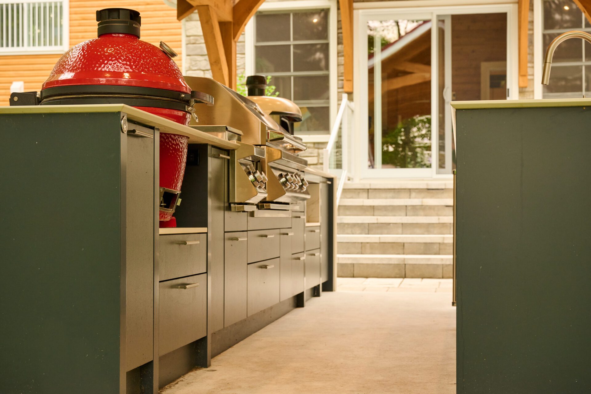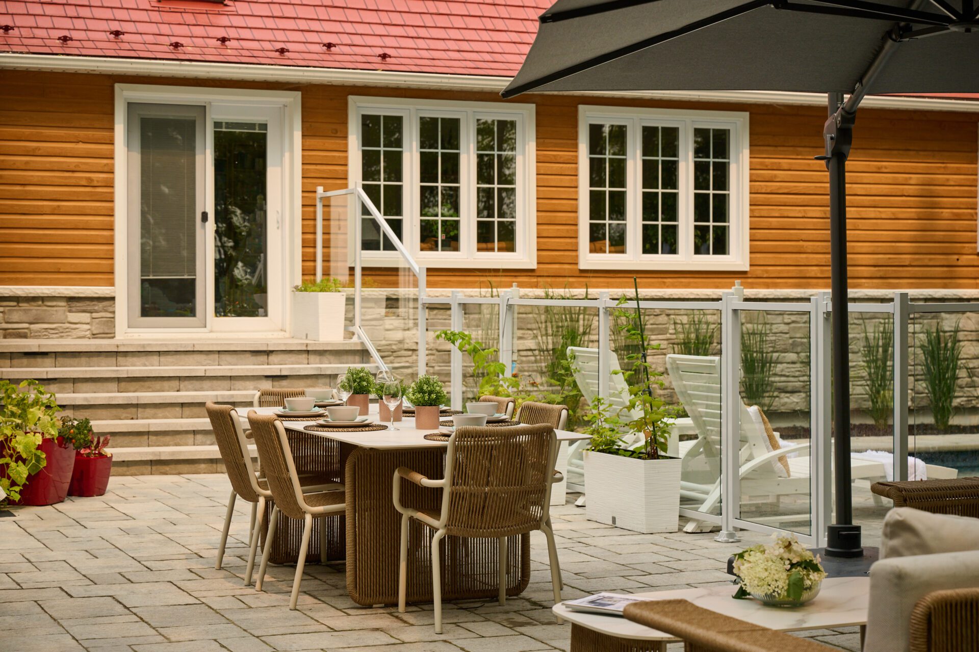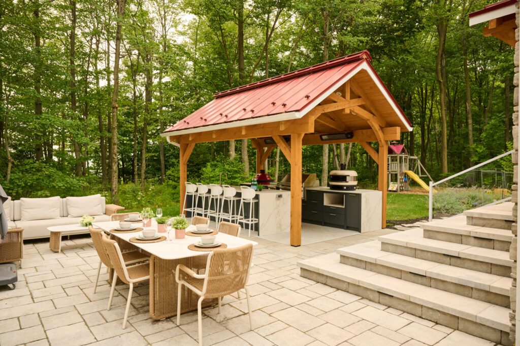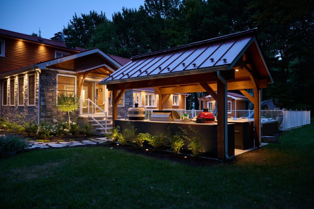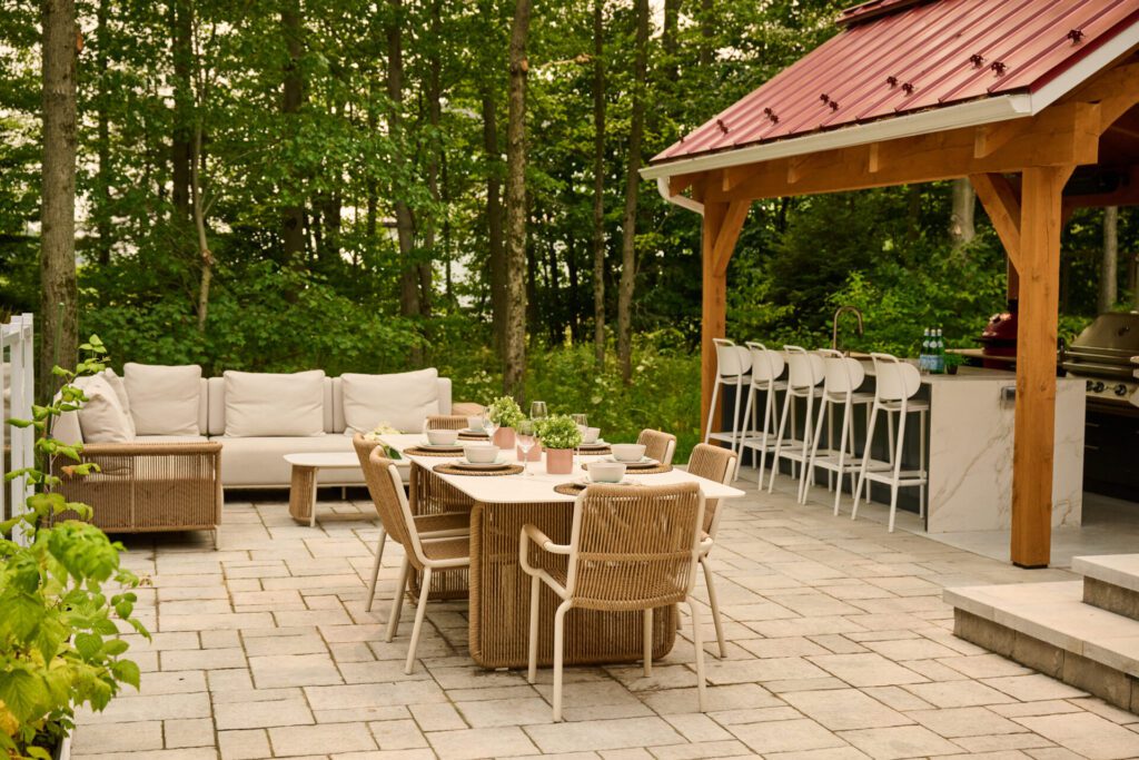 Un pavillon entièrement équipé accueille une cuisine extérieure complète, parfaite pour recevoir et profiter des belles journées d’été. À proximité, une salle à manger extérieure et un salon de jardin créent un ensemble cohérent et chaleureux, favorisant les rassemblements familiaux.