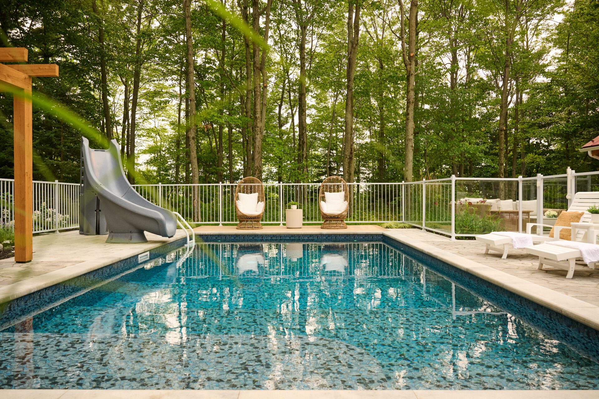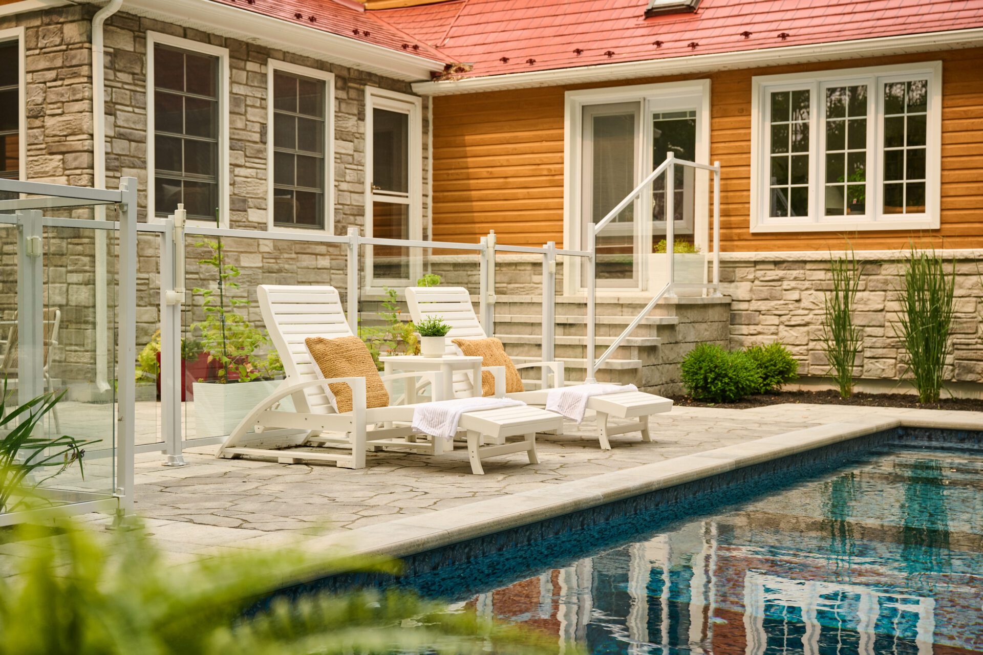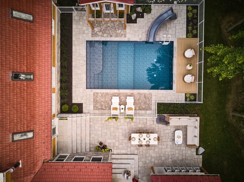 Au cœur de l’aménagement, une nouvelle piscine creusée s’intègre élégamment à une grande terrasse en pavé. Autour du bassin, plusieurs zones ont été aménagées afin de maximiser le confort : espaces détente avec chaises longues, plateformes en bois, jardins structurés et circulation fluide entre les différentes aires.