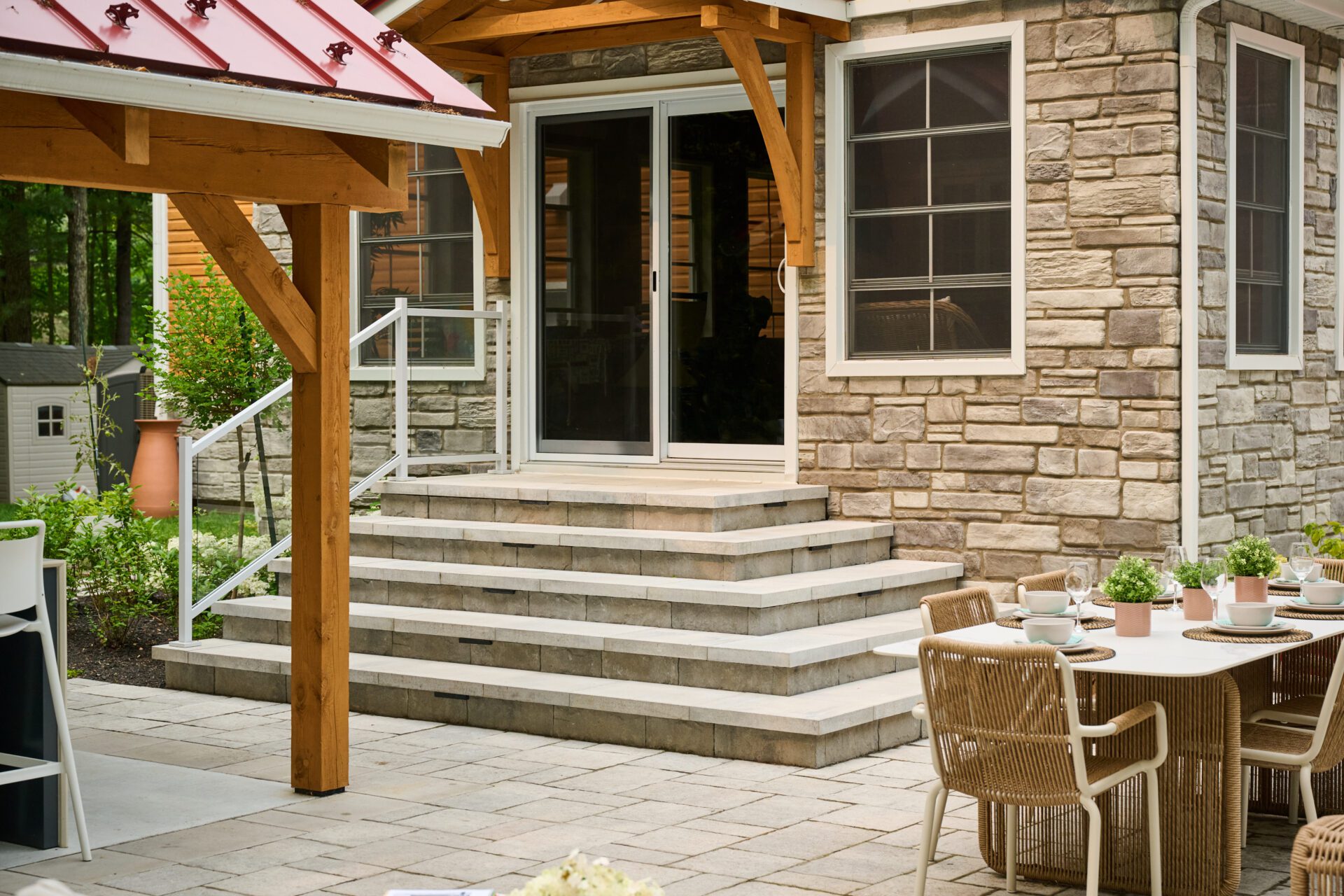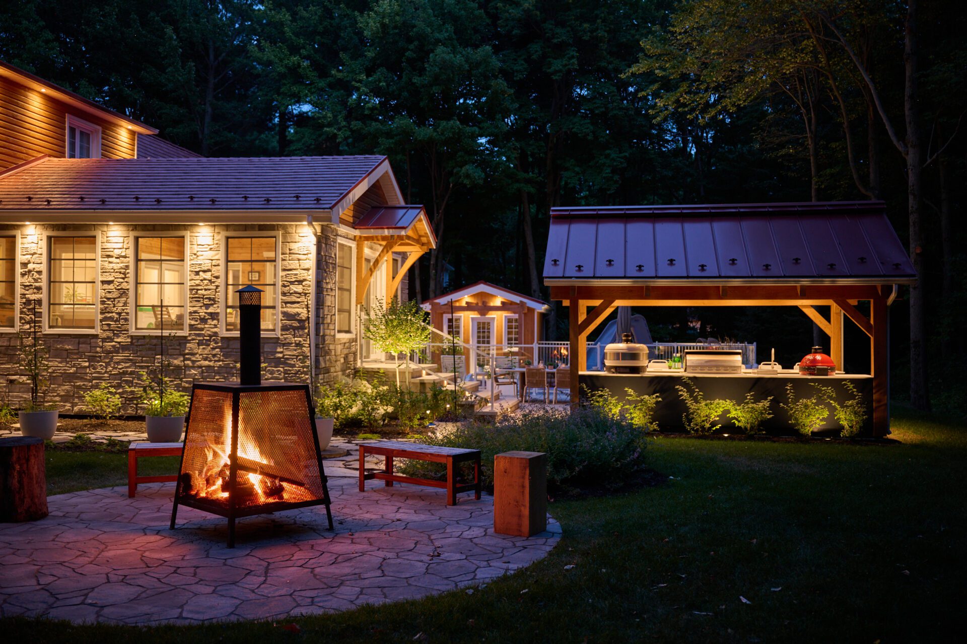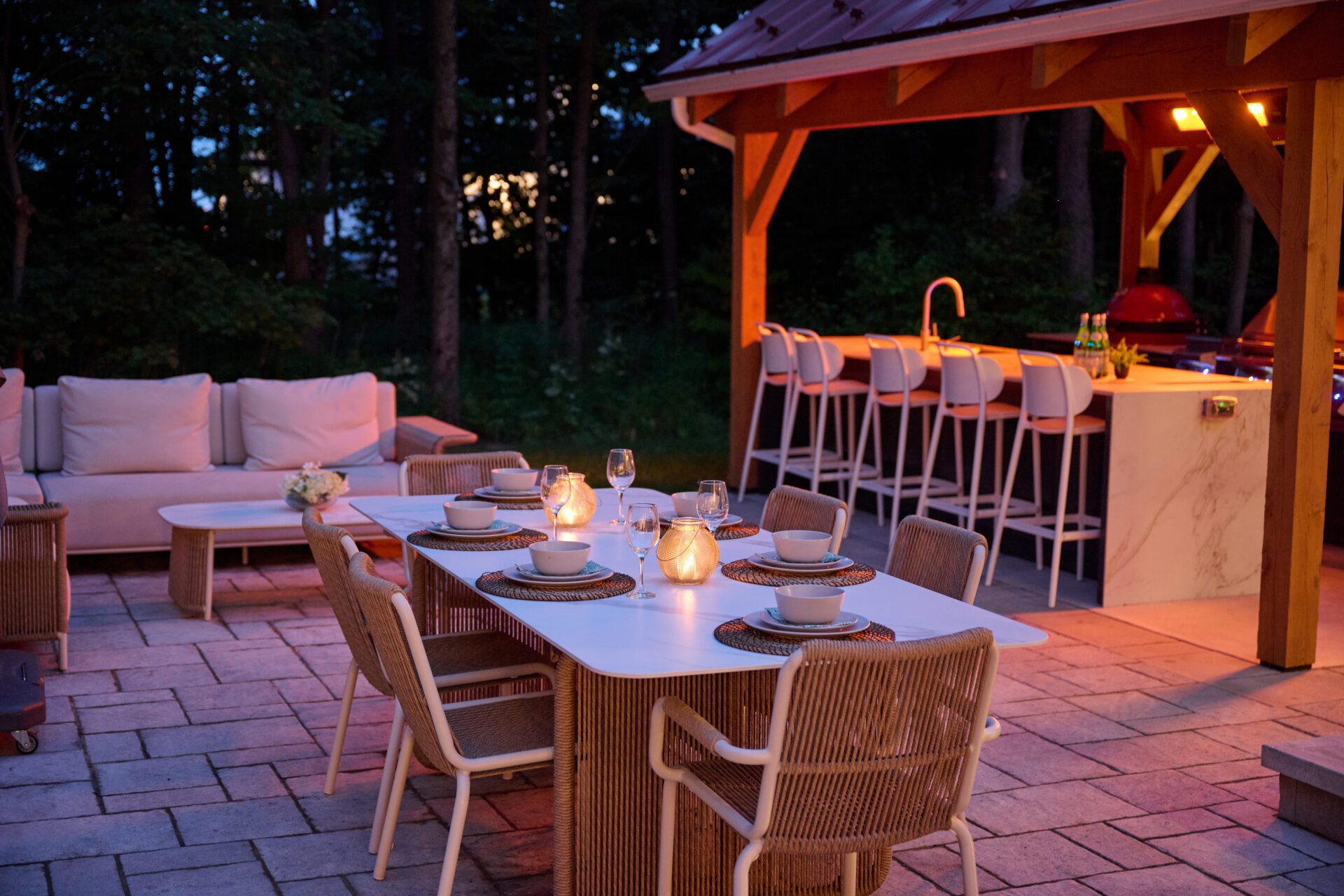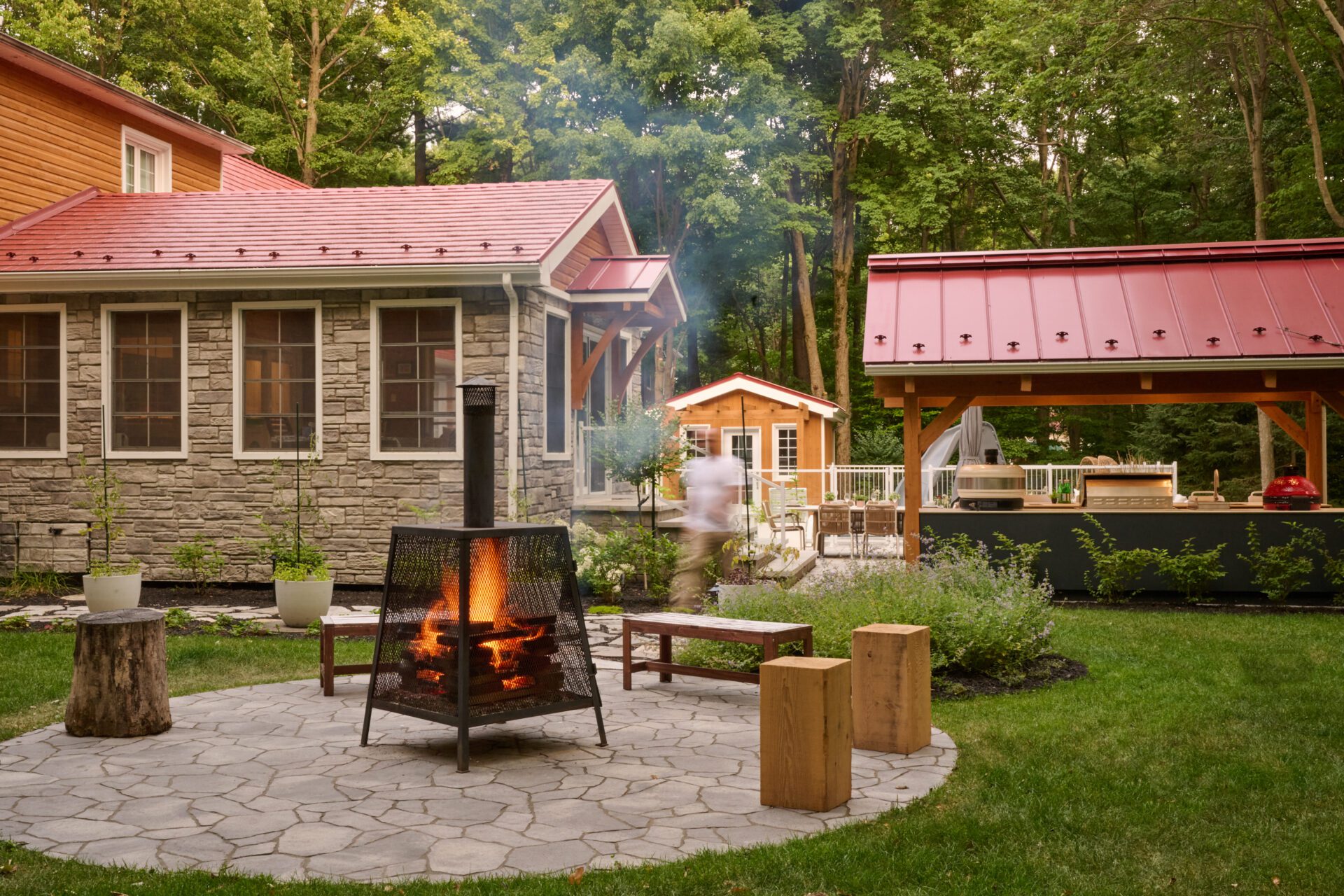 Plus éloigné du centre de l’action, un coin feu au design rustique offre un espace intime et relaxant. Installé sur une dalle en pierre naturelle et entouré de mobilier simple et robuste, il devient un lieu idéal pour prolonger les soirées en plein air.