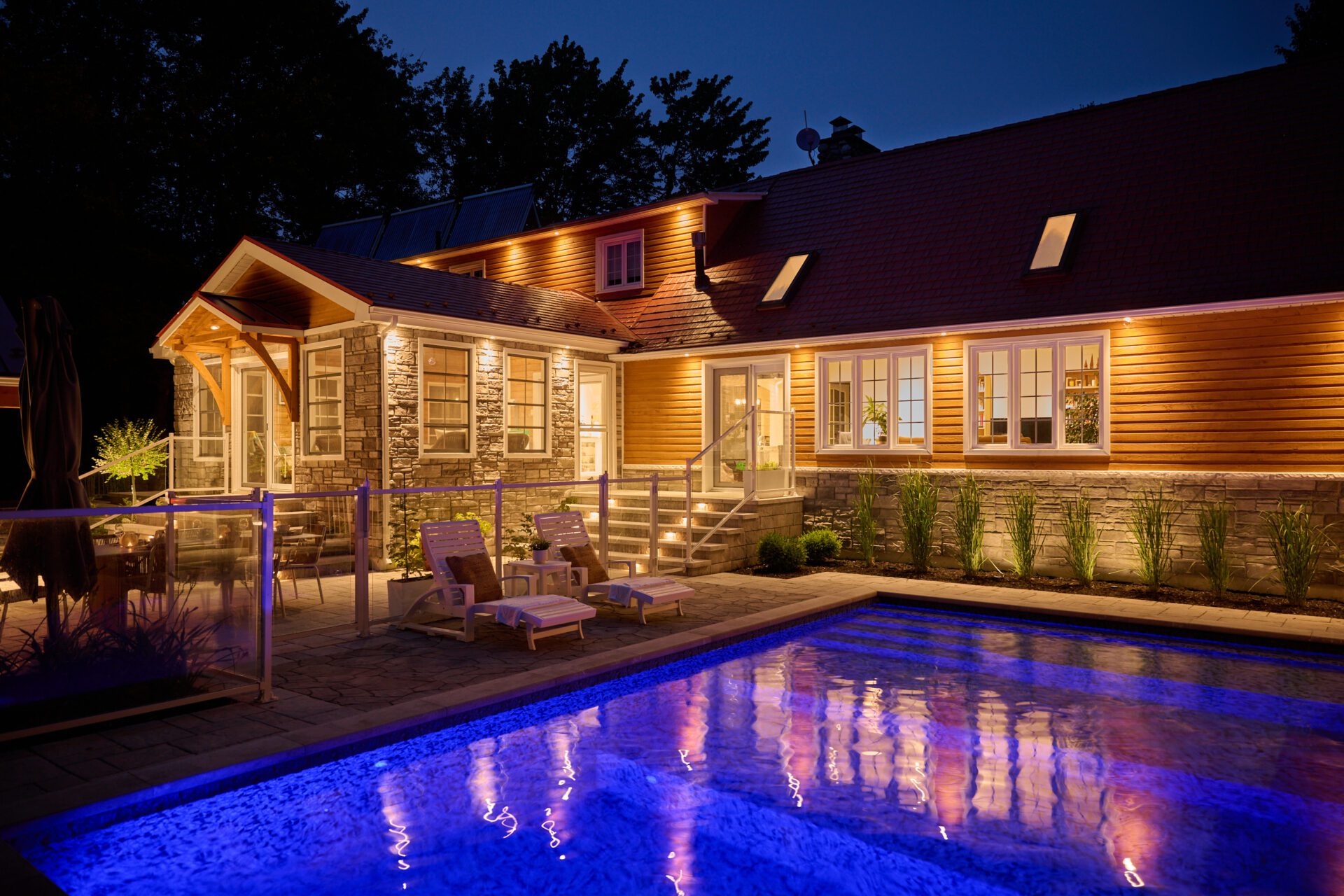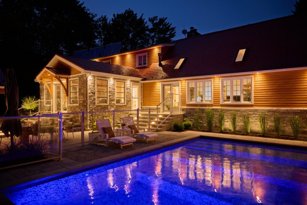 Finalement, l’ensemble du site est mis en valeur par un éclairage de jardin soigné. Celui‑ci souligne les matériaux, sécurise les déplacements et crée une ambiance douce, particulièrement spectaculaire autour de la piscine et des façades de la résidence une fois la nuit tombée.
